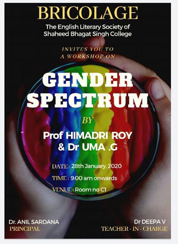 “As long as she thinks of a man, nobody objects to a woman thinking.” these lines by Virginia Woolf reiterate the fact that every line of thought in our minds is embedded within the framework of gender . After ages of human civilization, it is sad to see gender still being reinstated under the binary lenses as male versus female or masculine versus feminine .To comprehend gender is to understand its plurality which is the why ‘Bricolage’ the English Literary Society of Shaheed Bhagat Singh College invites you to an enlightening workshop by eminent faculties from Indira Gandhi national university. Prof Himadri Roy has been teaching queer studies for more than decade in the School of Gender and Development Studies of Indira Gandhi National Open University, New Delhi. He has also taught English Literature at the University of Delhi before joining Indira Gandhi National Open University. He has published books on sexuality and cinema , one of them being Reel and the Real: Portrayal of Gay Men in Bollywood Cinema (2020). He has contributed many articles in international and national journals on queer studies, sexuality and cinema, sexuality and literature and feminisma and Literature. He is also a novelist and his recent novel Tales of Hope Chasers has been acclaimed as a ‘must-read’ by the Times of India. Mark the date and be a part of this enlightening session by registering on the below stated link.